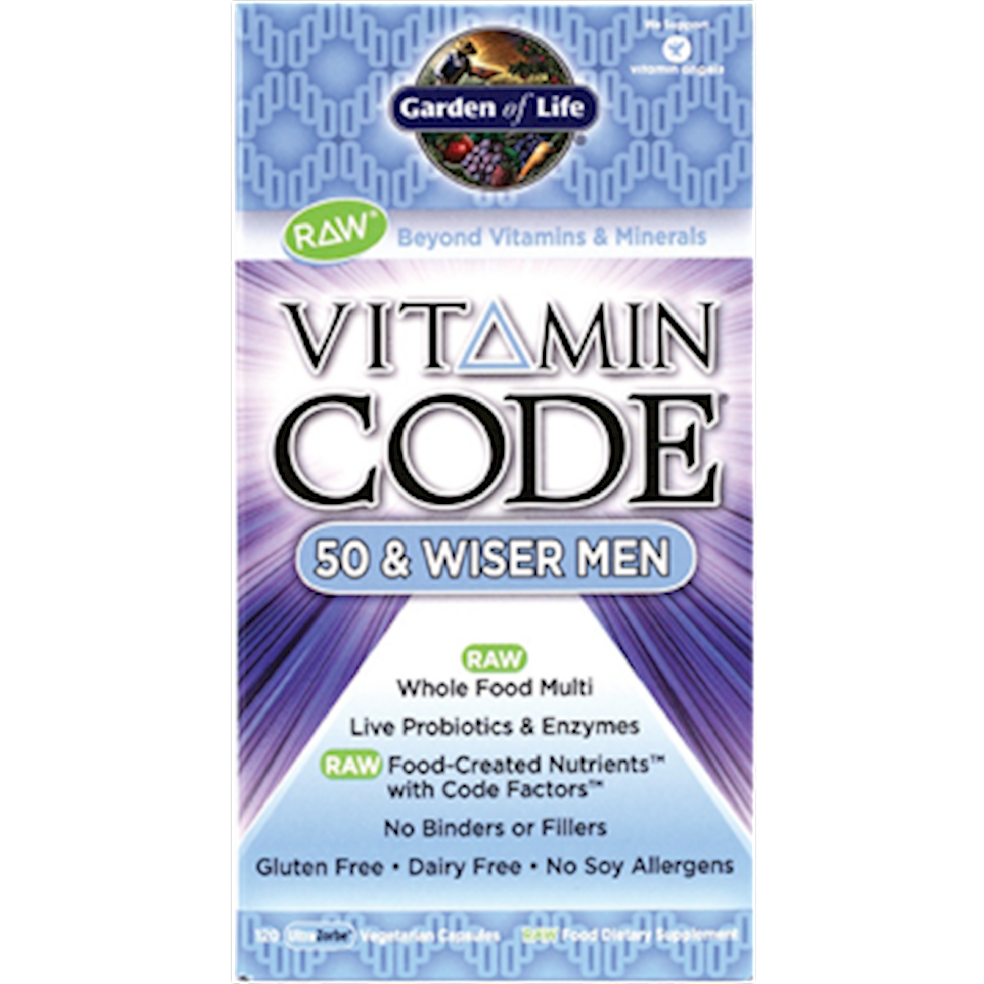 Made with individually grown nutrients utilizing probiotic cultivation to produce RAW Food-Created Nutrients, Vitamin Code supplements are delivered in a whole food base of fruits and vegetables. Vitamin Code supplements are RAW, which not only means that they are produced below 115 F, but also means that these nutrients come with their natural cofactors, along with live probiotics and enzymes, just like raw foods! Vitamin Code raw powders are delivered in capsules without any binders or fillerseverything you want and nothing you dont want. Vitamin Code 50 & Wiser Men is a comprehensive whole food multi-nutrient formula, specifically formulated to meet the unique needs of men over 50, providing the nourishment the body craves to support optimal health and well-being.* Twenty-three fruits and vegetables add supporting antioxidants, vitamins and nutrient cofactors. RAW means no high heat, synthetic binders, fillers, artificial flavors, sweeteners, colors or additives commonly used in tablets. Whole food means RAW Food-Created Nutrients are blended in a base of 23 fruits and vegetables together with food cofactors. Vitamin Code 50 & Wiser Men Benefits: Supports healthy heart and blood pressure support within the noraml range** Supports prostate health* Supports memory and concentration* Supports healthy digestion with live probiotics and enzymes* Vitamin Code 50 & Wiser Mencomprehensive RAW whole food multi-nutrient formula to meet the needs of men over 50.